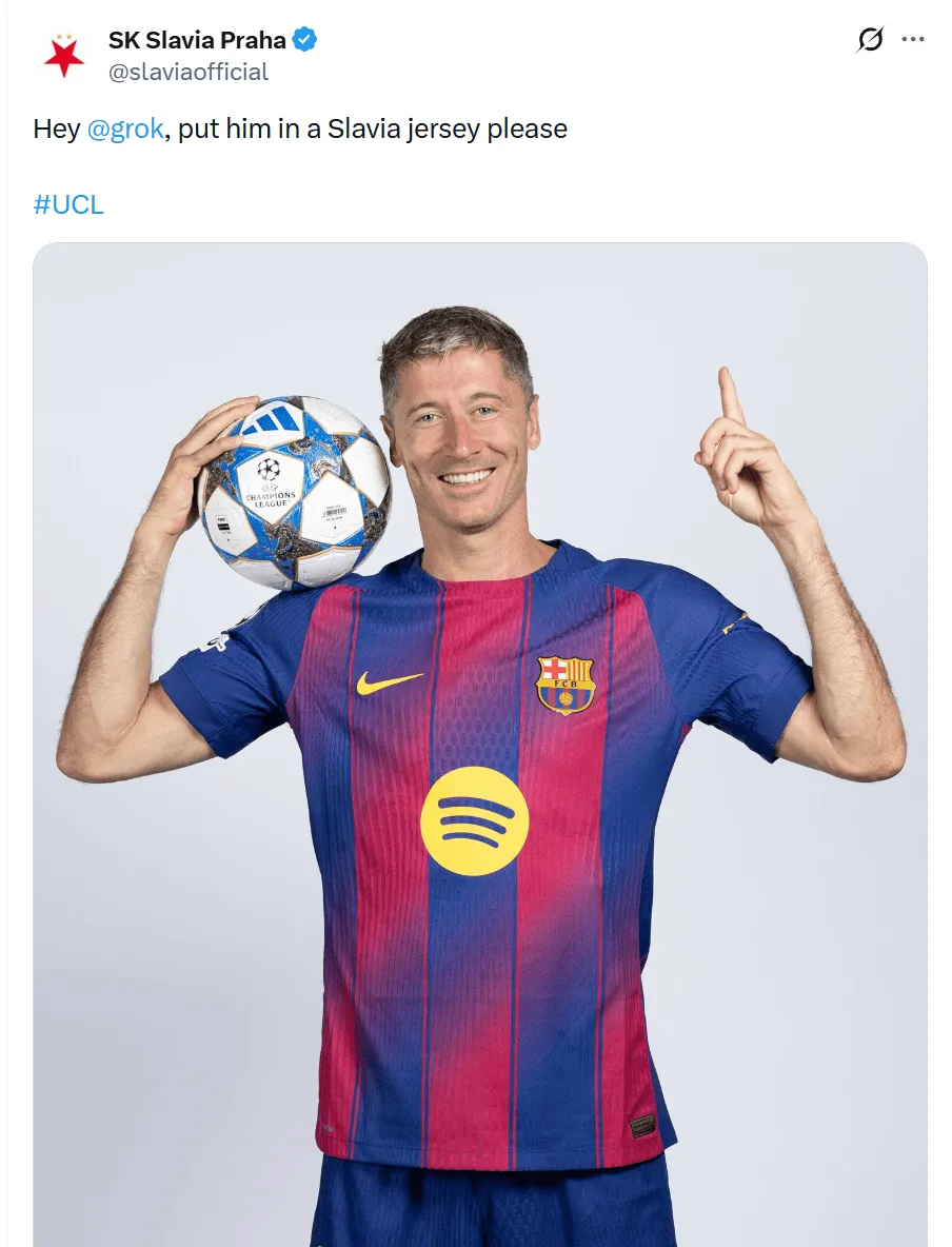 赛后,布拉格斯拉维亚官推整活,让AI机器人把莱万P成自己球员。