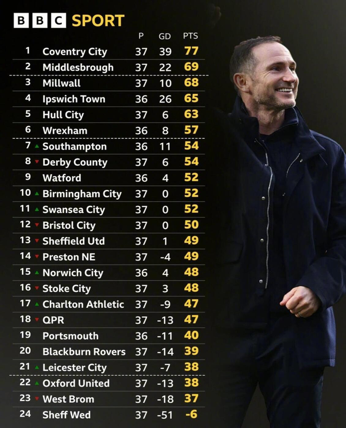 在本轮英冠第37轮比赛后,由兰帕德执教的考文垂以3-0击败普雷斯顿,与此同时排名紧追其后的米德尔斯堡在主场不敌查尔顿。